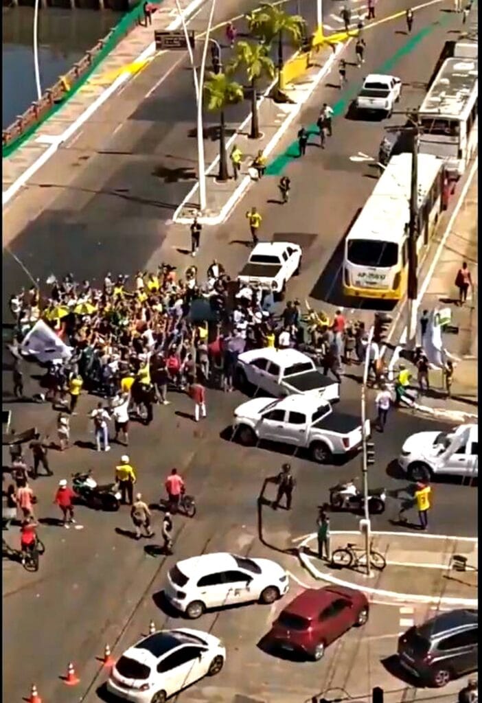 Em clima de campanha, bolsonaristas usaram até um carro de som para anunciar a presença do presidente, que desceu do carro no meio da rua. As imagens foram divulgadas por Bolsonaro nas redes sociais dando a aparência de que seria uma manifestação espontânea.