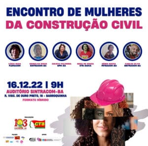 Nesta sexta-feira (16/12), das 9h às 12 horas, trabalhadoras da construção participam do Encontro de Mulheres da Construção Civil, no auditório da sede do SINTRACOM-BA, na Barroquinha, em Salvador.